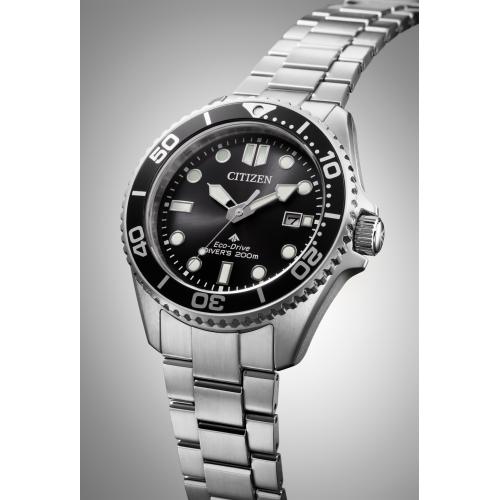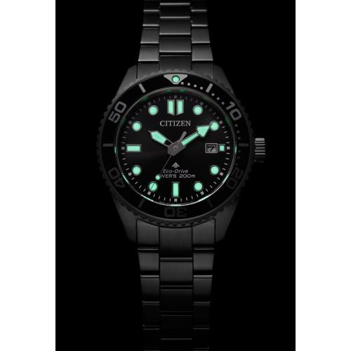 どれだけ潜っても届くことのない深い海の底へ。本格仕様のダイバーズウオッチ。プロマスター「MARINEシリーズ」。コンパクトなサイズ感と正統派のデザインにこだわった、エコ・ドライブ ダイバー200m。回転ベゼルは、外周全体にやや深めの溝を刻んだオーソドックスな仕上がりで、優れた操作性も実現しています。