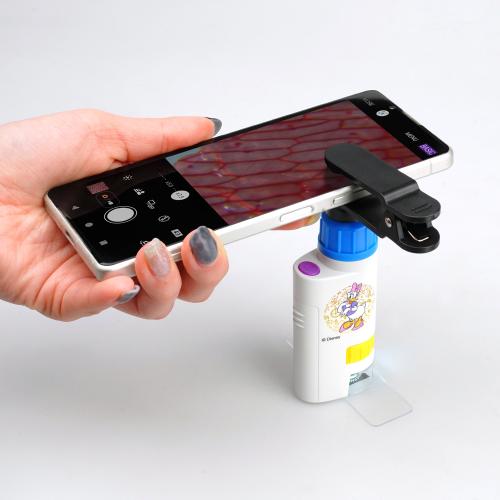 スマートフォンを取り付けて撮影可能な、ハンディ型顕微鏡。