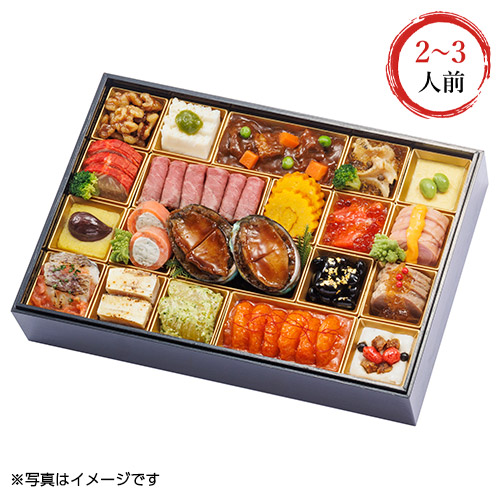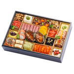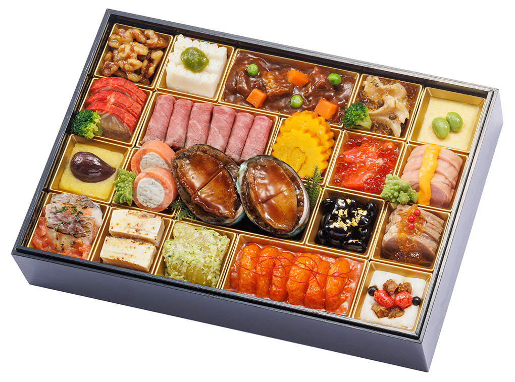 くるみ甘露煮、炙り烏賊の翡翠味噌掛け、梅香る姫皮たけのこ、牛肉赤ワイン煮、ツブ貝の山椒煮、味付ブロッコリー、とうもろこしムース、蜜汁叉焼、大豆やわらか煮、ローストビーフ、ミックスビーンズコンソメ煮、伊達巻柚子風味、鮭ルイベ漬いくら掛け、鶏の燻製チーズソース掛け、ロマネスコオイル和え、五郎島金時の渋皮栗きんとん、クリームチーズスモークサーモン巻、鮑オイスター煮、だし若布、黒豆金箔、立山ポーク味噌漬、真鯛の塩麹焼きトマトソース、かぶら甘酢漬、鰤とろ西京焼、鰤しぐれ煮、数の子ジェノベーゼ、海老のチリソース、いちじく入りクリームチーズ
