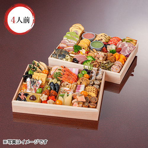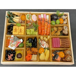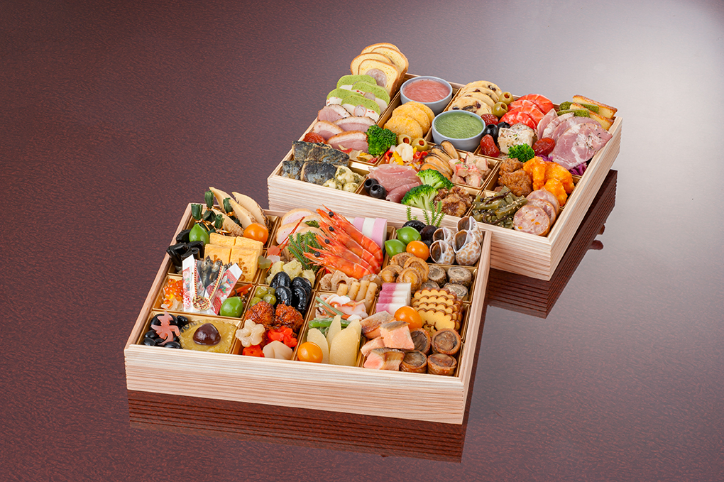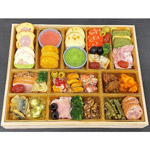 牛肉しぐれ笹包み、焼筍煮、昆布巻、寿だし巻玉子、紅白なますいくらのせ、松前漬、田作り、黒豆煮、寿ようかん、渋皮栗きんとん、なごみ巻(海老)、なごみ巻(ほうれん草)、牛肉と牛蒡のしぐれ煮、筍木の芽味噌和え、松竹梅松葉、お多福豆、うぐいす豆、真だら子旨煮、花こんにゃく・赤、花こんにゃく・白、紅蒲鉾、白蒲鉾、鶏肉と根菜の旨辛煮、海老艶煮、叩き牛蒡、いか梅酢、山うど酢味噌、味付数の子、椎茸煮、バイ貝旨煮、山くらげ菊花和え、貝照焼、さんま八幡巻、いちごミルク羊羹、伊達巻、鮭味噌焼、穴子八幡巻、金柑蜜煮、若桃甘露煮