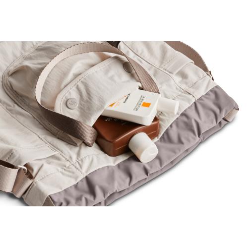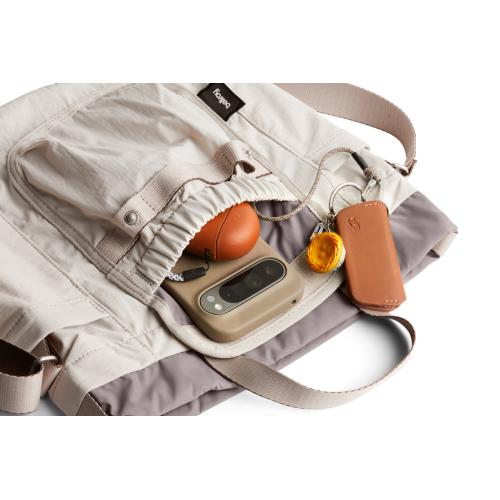 瞬時に開閉できるドローコードデザイン調節可能なショルダーストラップ斜め掛け、肩掛け、手持ちの3通りの持ち方が可能耐久性のある超軽量構造外側にポップポケット2つ外側前面に大きめのスナップボタン付きポケットアルミニウム製キーフック内側に他のアイテムと貴重品を分けて収納できるファスナー付きポケット耐水性のあるリサイクルナイロンファブリックを使用主素材: リラクソウィーブ