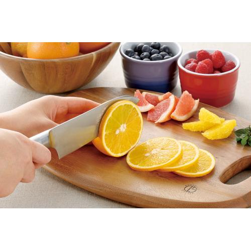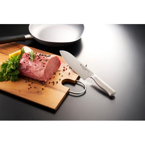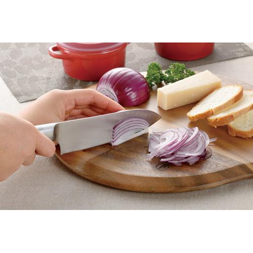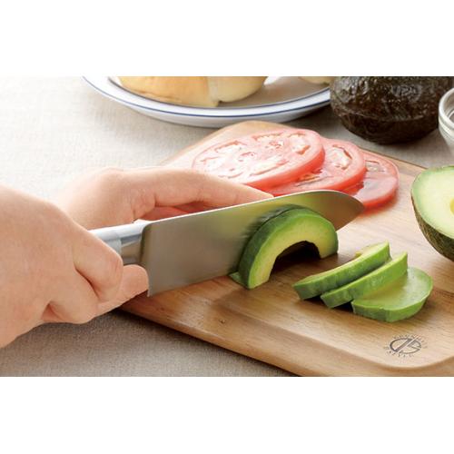 長時間使用しても疲れが少なくて済むよう形状と共に、重さのバランスもサイズごとに検討されたデザイン。三徳包丁として一般的なサイズのキッチンナイフです。芯材にはモリブデン・バナジウムを添加した切れ味が長続きする特殊ステンレス、左右の地金には粘り強い13クロームステンレスを使用した3層鋼。鋭い切れ味と折れにくさ、錆びにくさを併せ持つ刃物用ステンレスです。熟練の職人が一本一本丁寧に本刃付けを行っており、研ぎ直しが可能。ハンドルは18-8ステンレスを使用しており、木製ハンドルに比べ雑菌の繁殖を防ぎ、衛生的。