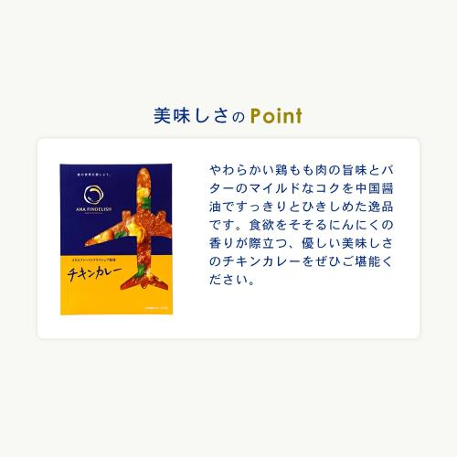 ANAオリジナル ビーフコンソメスープ:1箱(1本2.6g×20本入り) 阿波尾鶏とマッシュルームのカレー:1人前(180g) ANA FINDELISH ビーフカレー:1人前(180g) ANA FINDELISH チキンカレー:1人前(180g) ANA FINDELISH ポークカレー:1人前(180g)