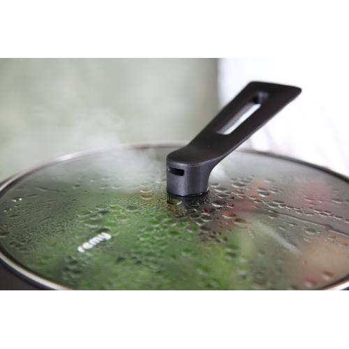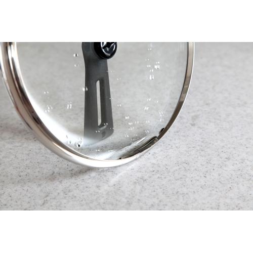フタ中央の蒸気穴は吹きこぼれを防止してくれる他、全面ガラスなので食材の様子が一目瞭然。