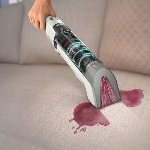 こぼした時にサッと使えるハンディタイプなので急な汚れでもサッと対応できます。2種類の専用洗剤がスプレーヘッドで混ざることで水と比べて2倍の洗浄力を発揮。※パワフルなモーターで分解した汚れや水分が繊維に入り込む前にしっかり吸引します。様々な角度で使用できるため、ソファーや車のシートの背もたれなど普段掃除がしにくい場所も掃除ができます。場所によってアタッチメントを取り替える煩わしさもありません。※ コーヒーと赤ワインでの第三者機関における調査結果