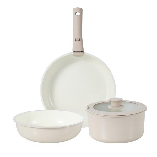 ・内面セラミック塗膜加工、遠赤外線効果で食材の中まで火が通りやすい。・シリコーン塗装で握りやすい。・ハンドルエンド部のフック穴でフックに掛けやすい。・どの色にも合わせやすく、高級感のあるミルクティーカラー。