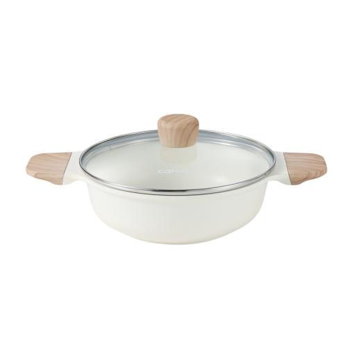 ・フッ素コーティングでこびりつきにくい。・内面アイボリーカラーが料理を美しく引き立てます。・一体成型で洗いやすい。・キッチンに自然と馴染む、シンプル&スタイリッシュな佇まい。・IH・ガス火オール熱源対応