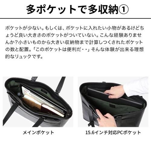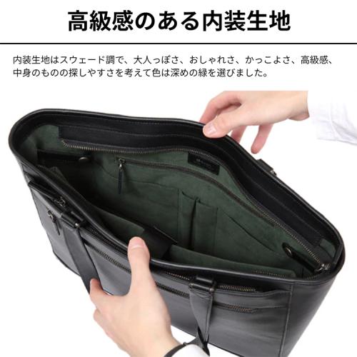 収納力と高級感を兼ね備えた、ととのうレザートート「バッグの中をととのえる」をテーマに開発された、多機能な本革レザートートバッグ。ビジネスシーンでもプライベートでも活躍する、シンプルで洗練されたデザインです。表面には傷・水・汚れに強い顔料仕上げの本革素材を採用し、内装には深みのあるグリーンのスウェード調生地を使用。高級感と使いやすさを兼ね備えた、理想的なビジネストートバッグです。主なポイント- 多収納&大容量トートバッグ:小物からA4書類、ノートPCまで整理できる多ポケット設計- バッグインバッグ付属:取り外し可能で、バッグ内の散らかりを防ぎ、他のバッグにも利用可能- PC収納ポケット:15.6インチまで対応、仕事用ノートPCも安心して持ち運び- スマホクイックポケット:満員電車や移動中でもスムーズにスマホを出し入れ- 前面・最前面ポケット:よく使う小物に素早くアクセス可能- 安心のYKKファスナー:アンティークブラック仕様でデザイン性も高い- 顔料仕上げ本革:水や傷、汚れに強く、お手入れも簡単- スウェード調の内装生地:高級感と視認性を両立した深緑カラー- キャリーオン機能:スーツケースのハンドルに固定して出張・旅行も快適- 肩掛け・手持ち両用:長めに設計されたハンドルでスタイル自在- 持ち手固定バンド付き:ショルダーがバタつかず快適- 自立構造&底鋲付き:床置きでも安定し、底面の汚れを軽減