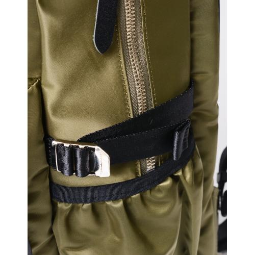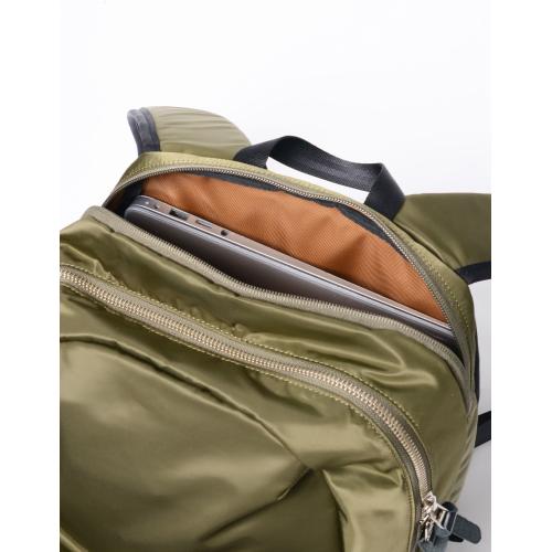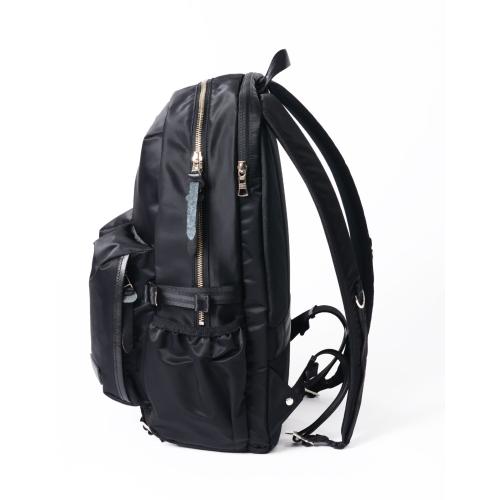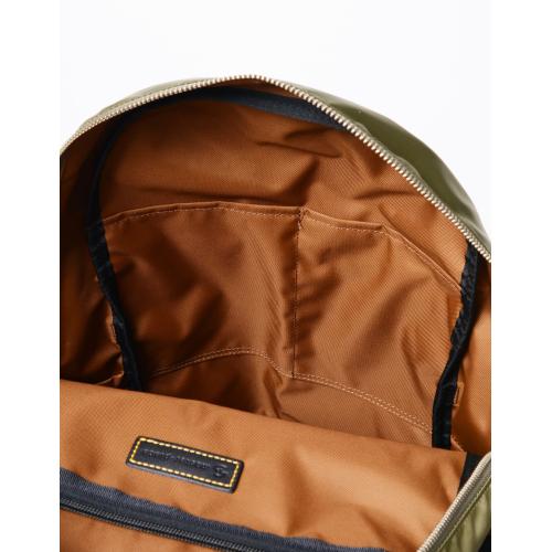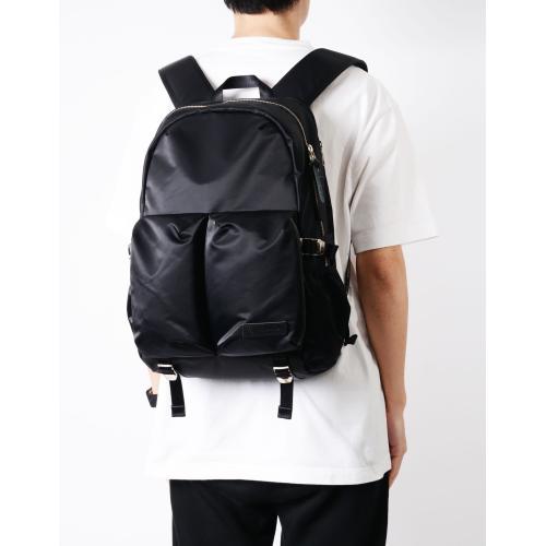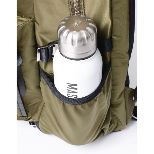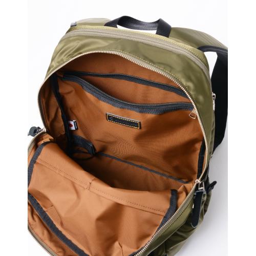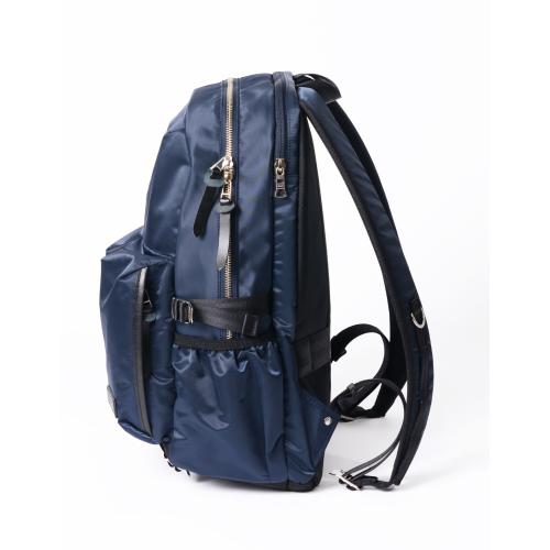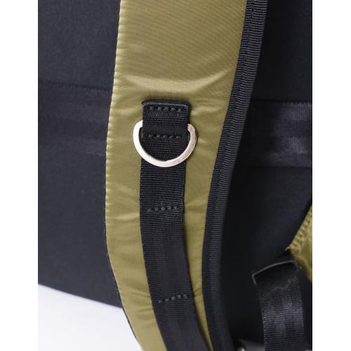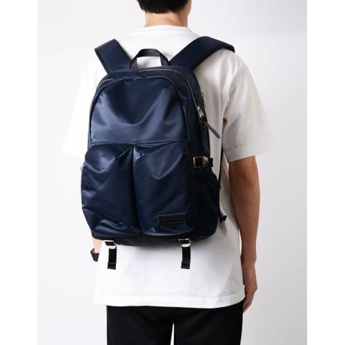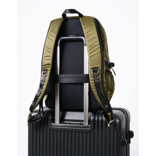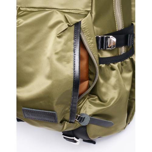 ・本体生地はビンテージのフライトジャケットの生地をモチーフにしたナイロンツイル。・生地の表面には撥水加工、裏面には防水機能。・付属や引き手には環境に優しいエコ牛革を使用しております。・荷物によってバックルベルトでマチ調節が可能。・背面にはキャリーバーに対応。