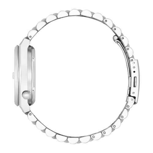 発色の良い文字板にシンプルでベーシックな針とインデックスを組み合わせ、すっきりとしたデザインが魅力の機械式時計です。スポーティなケース形状と腕なじみの良い3列バンドで付け心地の良さにもこだわり、カレンダー部分には視認性を高める拡大鏡レンズを採用しました。シースルーバックの裏ぶたで、機械式時計ならではの回転する錘(おもり)やメカの動きを楽しめます。
