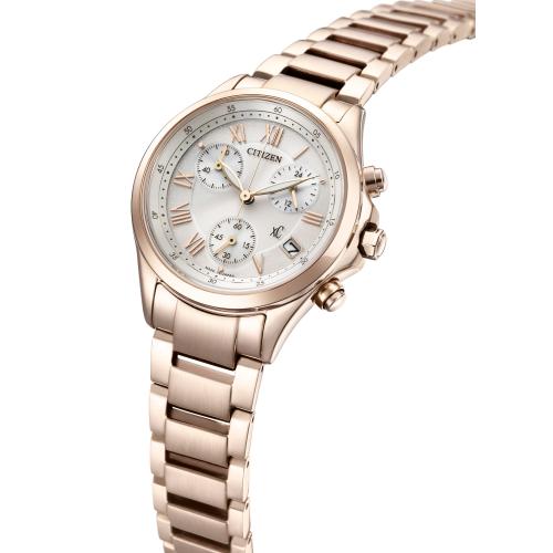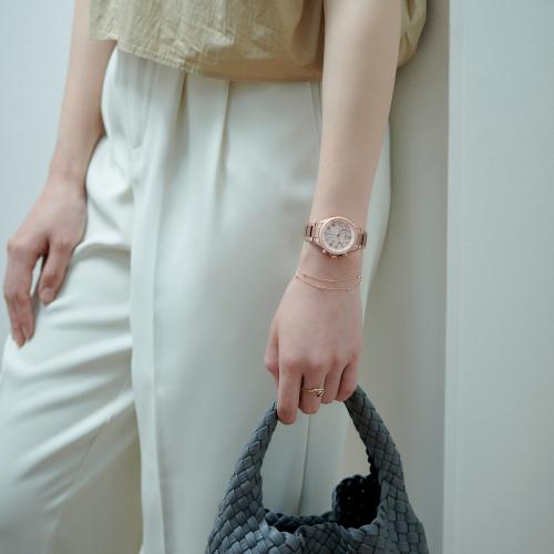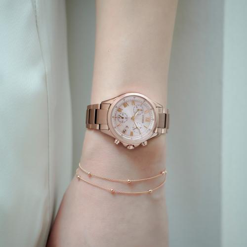 どんなスタイルにも合わせやすい、上品で洗練されたベーシックなデザイン basic collection。華やかなサクラカラーを纏った女性の腕元を知的に飾るクロノグラフ搭載のエコ・ドライブモデル。ケース径32mmのミディアムサイズで、いつものコーディネートを上品に知的に演出します。文字板にはすっきりとした印象のローマ数字インデックスを採用。インダイヤルはシンプルで視認性にも優れています。
