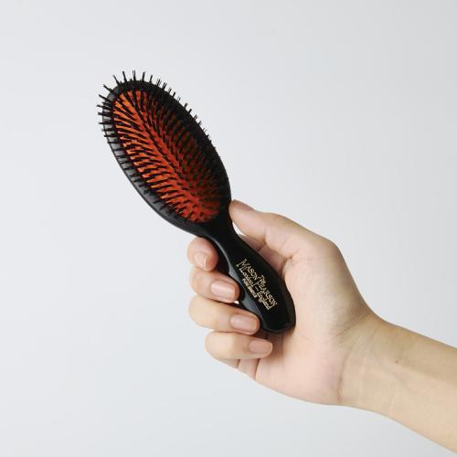 標準的な硬さの猪毛を100%使った、初めて猪毛のヘアブラシを使う方にもふさわしい1本。ポーチにも入れやすいコンパクトなサイズで、お出かけにも最適なモデルです。メイソンピアソンのヘアブラシは、高品質な猪毛と、独自に設計されたクッションパッドを使用し、熟練の職人が手作業で作り上げています。高い耐久性と、使うほど髪にブラシの毛が馴染んでいくことも特徴。“一生モノ“として一人一人の髪に寄り添います。