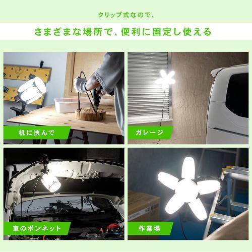 ●開閉式LED球●閉じて広角照射・開いて前方照射●そのまま使えて便利な5m電源コード●連結コンセント付き(総電力500Wまで)●強力大型スチール製クリップ式