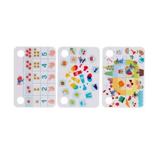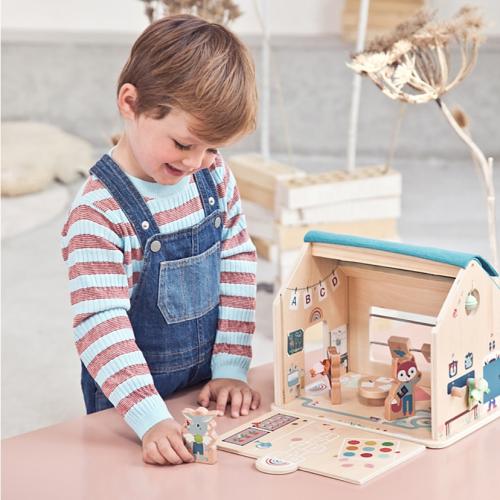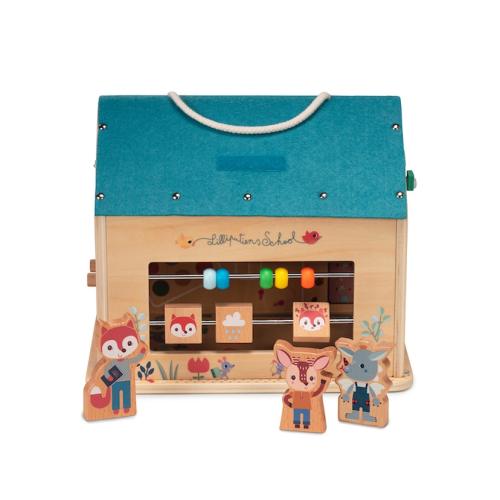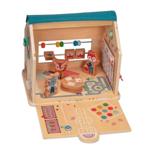 学校の屋根を開けると、たくさんの”学び”が詰まった教室が現れます。窓にはミニそろばんや動く図形、外壁には時計もついています。3種類の学べる両面シートで学習できます。小さな鐘をしたら休み時間に、片面のボードを取り外すとグラウンドに早変わり!ジョーとステラはランドセルと連絡帳を置いて、石けり遊びします。屋根の上には紐が付いてあるので持ち運びしやすく、楽しみながらしっかり学べます。