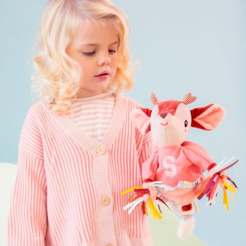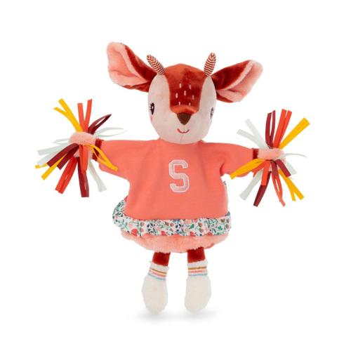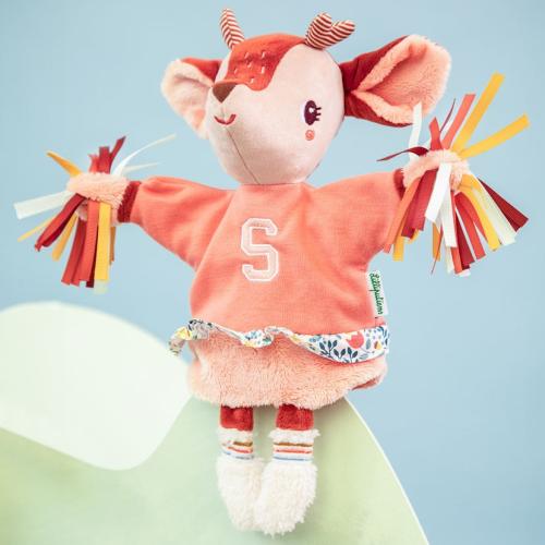 陽気なチアリーダーのステラのパペット。手を入れて動かすと、カラフルなポンポンを振るステラが躍動します。彼女は幸せを伝えるリリピュションのエンターティナーです。