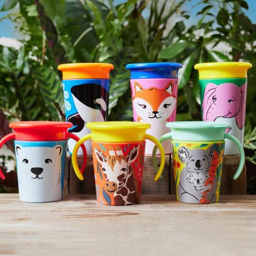 逆さにしてもこぼれにくいミラクルカップの、絶滅の危機に瀕した動物モチーフの「ワイルドラブ」。カラフルでキャッチ―なデザインは、動物たちの環境にスポットをあて、SDGsについて考えるきっかけを作っています。ワイルドラブを通じて、世界中に思いやりを届けよう!