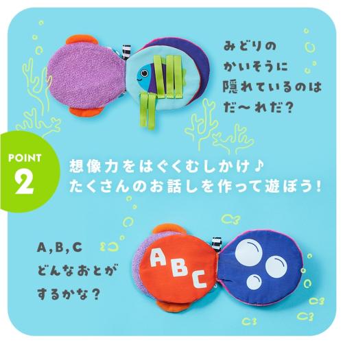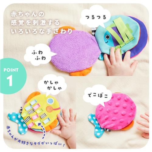 ふわふわ、つるつる、デコボコいろいろな触感を楽しめます。ページをめくると、海の中をテーマにした楽しいストーリが広がります。大きくなったら、自由にお話を作ってみたり、英語や数字のお勉強をしたり。お出かけの時にも安心のストラップ付き。【知育ポイント】さわってみよう:赤ちゃんは握ったり触ったりすることが大好き。指先の感覚は体全体や脳の発達につながります。