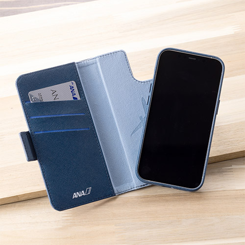 ●マグネットで手帳ケースと背面ケースを簡単着脱外れにくいマグネット特殊配列で手帳型ケースとしてご利用の際も落ちたりずれたりする心配なく、フリップケースと背面ケースがシームレスにフィットします。外出時は必要なカードを入れキャッシュレス時代に対応した手帳型ケースとしてお家ではフリップケースを外して背面ケースのみで気軽に使えます。●日常使いからビジネスシーンでも使える、ユニセックスでフォーマルなデザイン。・フリップケースと背面ケースが同じ色で統一感がありスタイリッシュ。・合成皮革(ポリウレタン)のサフィアーノ素材で手触りが良く、フォーマルなイメージでビジネスシーンにもぴったり。・カードポケット口が斜めでかっこよく取り出しやすい。ANAらしいブルーの背景が差し色に。●収納力抜群のカードポケットと画面を保護できる便利な手帳型ケース4か所のカード収納のうち、1か所は幅が広く、お札やレシートなども収納可能。外れにくいマグネットでしっかり閉じられるため、身分証や会社のIDカードなども安心して入れられます。●MagSafe対応ワイヤレス充電可能な高級感がある合成皮革(ポリウレタン)背面ケースMagSafe用高品質磁力のリングが内蔵されているので、MagSafe充電器やMagSafe対応アクセサリーを装着することが可能です。タッチ決済も利用可能で、キャッシュレスなライフスタイルに。●内側にはANAロゴと飛行機影も。さりげなく見えるデザイン嬉しいデザインです。●同シリーズのAirPods Pro(第2/1世代)ケースもおススメ。