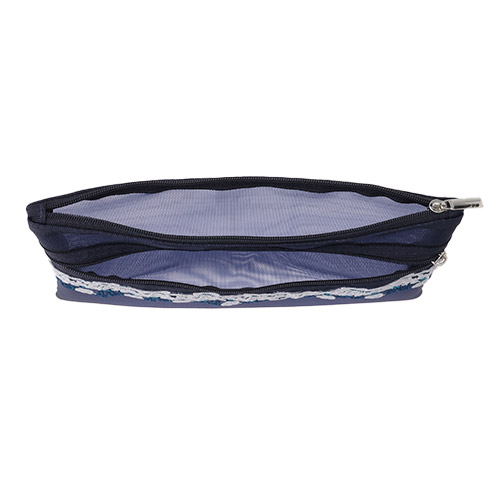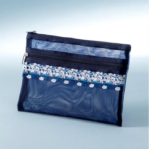 ANAオリジナルレースを施したダブルファスナーポーチ。メッシュ素材の程よい透け感が、中を確認しやすく、軽くて嵩張らない便利なアイテムです。メインポケットと外側の浅目のファスナーポケットの2つのポケットに分けて収納ができます。メインポケットにはコスメを、外側のポケットにはお薬を、等と用途とサイズに分けて便利にまとめられます。