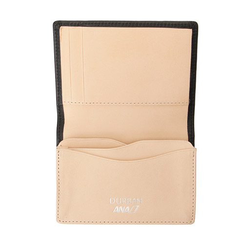 カード段にインデックス風に用いたラベルをレザーで表現。ご自身用、お客様用と分けて使用したり、複数の名刺を所持される方に便利な機能性、数枚のカードも収納できるので、ビジネス用のカード類をまとめて収納することも可能。表面のレザーは姫路で鞣されたきめの細やかなレザーを敢えて職人が手揉みを施し、独特のシボ感を出すことで細やかな個体差を演出。内側の革はヨーロッパ産の白ヌメを使用。使い込むほどに飴色に仕上がっていきます。デザインは今回、ANA用に新たに作ったもので、ほかでは展開していないオリジナル商品。内側にはD'URBANとANAのロゴをシルバー箔押し入り。<特長>・内側には使い込むほどに馴染む、自分色に染まるヌメ革を使用・職人の手揉みによる独特のシボ感・インデックス付きで小分けが簡単・名刺収納部は1ポケット約30枚、2ポケットで最大約60枚の収納が可能(名刺の厚みにより前後します)