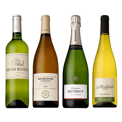 フランスの主要産地から厳選した白ワイン3本とシャンパーニュ1本を組み合わせた4本セットです。産地ごとの個性を楽しめる内容で、機内採用実績のある高品質なシャンパーニュも含まれています。
