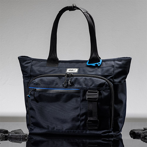 一般的なナイロン生地(420デニール程度)よりもはるかに強度が高い、1680デニールナイロンを使用し、強度、耐久性を備えたビジネストートバッグ。用途に応じて多くのスマートポケットを備えた使いやすさと、上品なダークネイビーカラーをベースにブラックのテープ使いで引き締め、随所にANAのイメージのようなブルーの附属や航空イメージを取り入れた仕様になっています