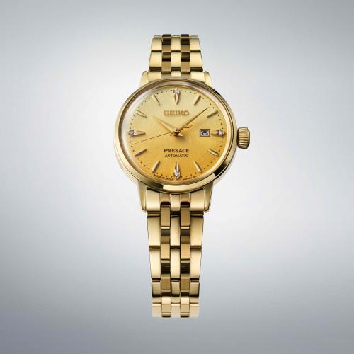 <セイコー>プレザージュ 自動巻 Cocktail Time SRRW006<セイコープレザージュ>Cocktail Timeシリーズから、30oの小径サイズで、ホットカクテルをイメージしモデルが登場。◆ポイント・カクテルを思わせる艷やかなカラーダイヤルが特徴のCocktail Timeシリーズから、30oの小径サイズで、秋冬の季節に合う温かさを感じるホットカクテルをイメージしモデルが登場。・ダイヤモンド一体型略字を12時、3時、6時、9時の4か所に設置し華やかさを演出。・裏ぶたはケースの厚みを軽減するためにフルメタルのスクリューバックを採用。・エッグノッグをイメージ。ダイヤルはカクテルのレイヤーを意識した縦グラデーションを採用。ムーブメント:キャリバー 2R05駆動方式:メカニカル 自動巻(手巻つき)時間精度:日差+45秒〜−35秒駆動期間:最大巻上時約40時間持続
