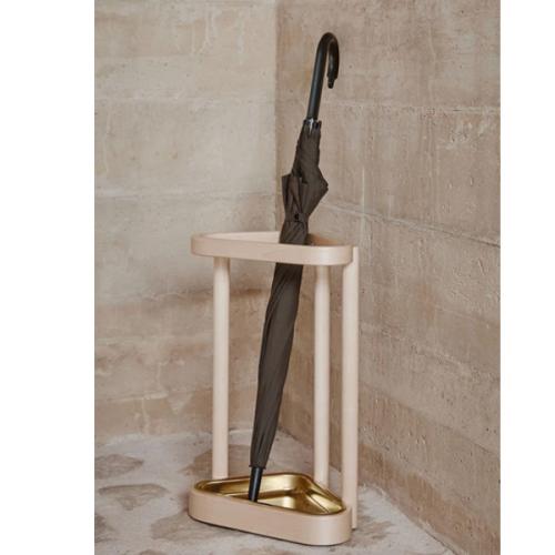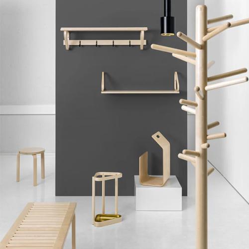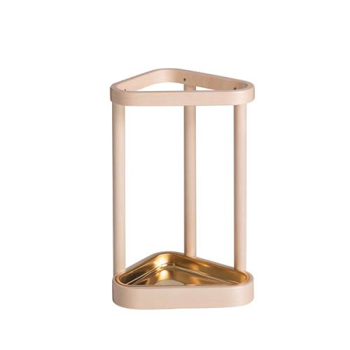 日々の暮らしを便利にする小さな家具のシリーズのひとつ「115 傘立て」は、1936年にアルヴァ・アアルトがデザインしました。合板を柔らかく曲げ、まるで無垢材のように滑らかで美しい見た目に仕上げる「ラメラ曲げ木」という技法を使っています。ラメラ曲げ木を用いてバーチ材をループ型に曲げた部品と3本のポール、真鍮を組み合わせたシンプルな構造です。底に設置する雨受けの真鍮トレイは、使用する年月の中で味わいを増し、緑青へと表情を変えていきます。