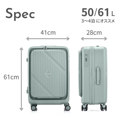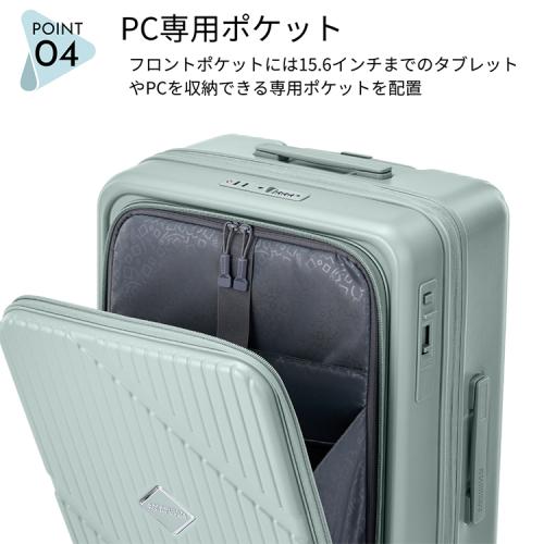 キャスターストップ機能を搭載した3〜4泊程度の旅行に最適サイズ。フロントポケットには15.6インチPC、タブレットなどの収納スペースを装備。