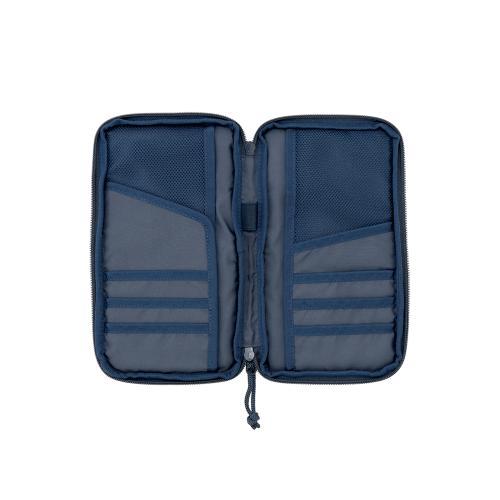 外側正面にポケットがあり、飛行機のチケットなどが入れやすい形状です。内側にはカード収納とパスポートを収納出来るスリットがあるほか、メッシュスリットなど多くの収納で整理がしやすくなっており、ケースの中心部にはペンホルダーも付属しています。ファスナーは信頼のYKK製を使用しています。