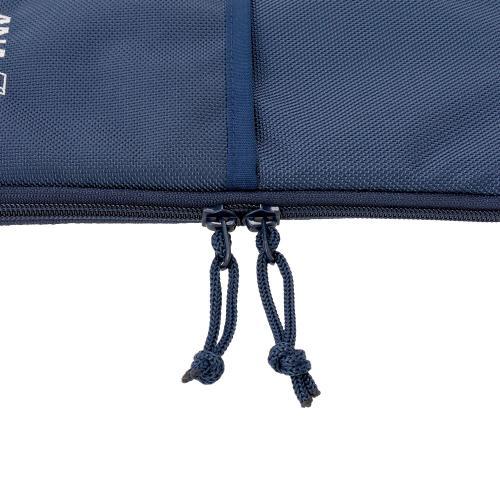 裏側にはキャリーケースに固定できるキャリーオンストラップを備え、外側正面のポケットに収納するポケッタブル仕様となっており、収納した後の正面部分にもロゴの刺繍があります。ファスナーは信頼のYKK製を使用しています。