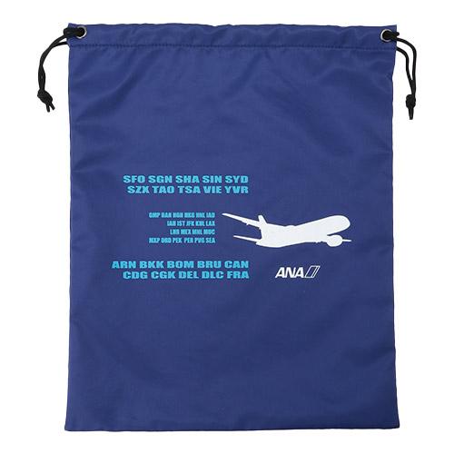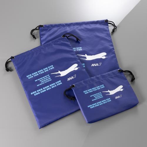 ANAの国際線の就航空港の3レターコードをデザインした巾着セットです。鮮やかなブルーが特徴的な3サイズ展開です。Lサイズは薄いトップス等の衣類、Mサイズは下着や靴下など、Sサイズは化粧品やバッテリー入れなど、用途ごとに仕分けができるので、旅行や出張に持っておくと便利です!