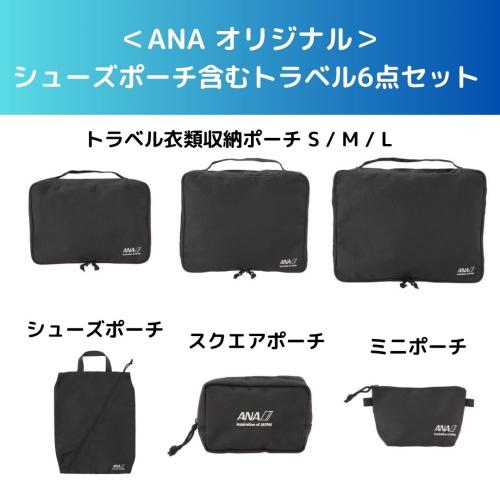 トラベル衣類収納ポーチL、M、S、シューズポーチ、スクエアポーチ、ミニポーチの6点セットです。 いずれもANAロゴとタグライン「Inspiration of JAPAN」を刺繍しています。存在感のある生地にブランドロゴを配したシンプルなデザインは、旅やビジネスのバディとして活躍してくれます。ファスナーは信頼のYKK製を使用しています。