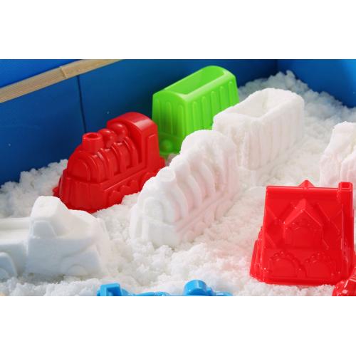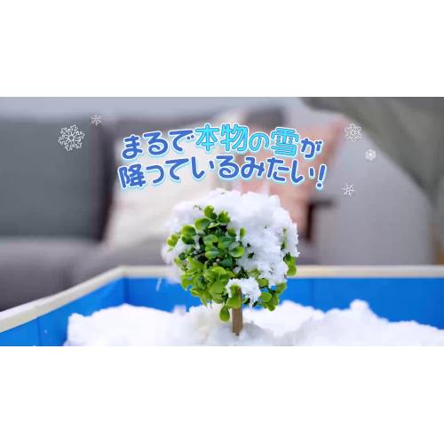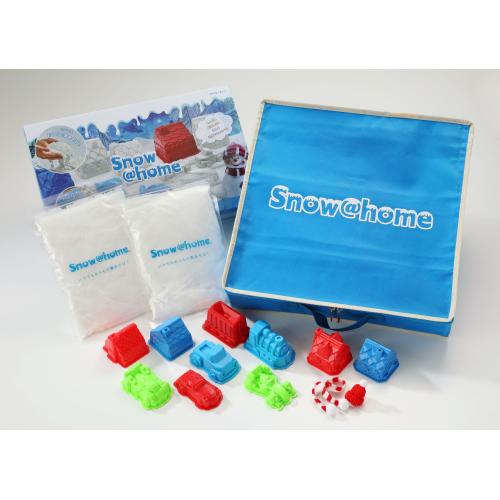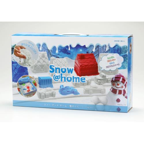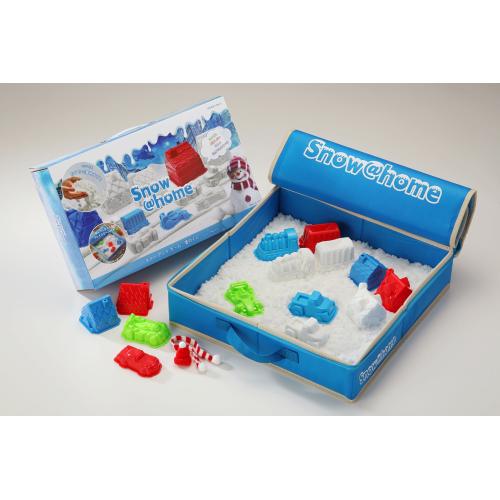スノーアットホームは不思議な手触りで大人も子供もワクワクします。ギュッと握るとかたまり、 指先でほぐすとふわふわとこぼれます。丸めたり、押し型をつかったり、遊び方は自由です。素材は乾燥せず固くならないので片付けも簡単。粉々にならないのでお部屋も汚れにくい。もっと多くの量で遊ばせたい!お客様の声から商品化。スノー1kg・蓋つき40cmの正方形のケースと大きな押し型10個付き。