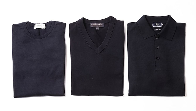 なぜ、この順番になるかというと、ポロニットは襟があるからです。次にクルーネックは、下着や肌が見えにくいから。Vネックは、開きがある分、一番カジュアルな印象になります。色は、ネイビーやグレー、黒などの上着に似合うように、ネイビーかブラックがいいでしょう。いずれにしても無地がおすすめです。素材は、ウールやカシミアシルクなどの混紡で、糸が細く編み目が細かいハイゲージのものを選ぶといいでしょう。