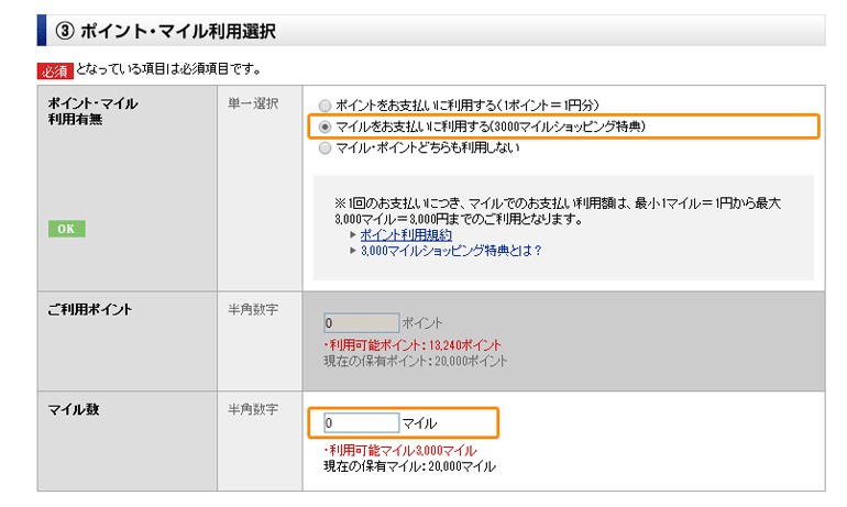 通常、ANAショッピング A-styleでマイルをお使いいただく場合は、10,000マイル以上(送料は別)から、「ANA SKY WEB」にログインしてポイント交換してからでないとご利用いただけません。3000マイルショッピング特典では、ポイント交換の必要なしで、1マイル=1円分としてご利用いただけるので、とっても便利です! ※3,000マイルまでご利用可能です。