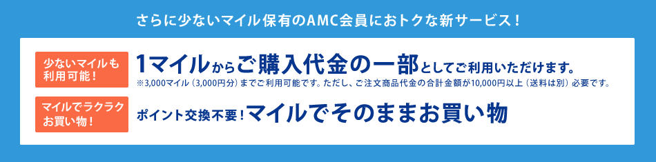 1回あたりのご注文商品代金の合計金額が10,000円以上(送料は別)で、1マイル=1円分としてご利用いただけるようになったANAマイレージクラブ(AMC)会員限定の3000マイルショッピング特典!マイルを使って、便利にショッピングが楽しめます!